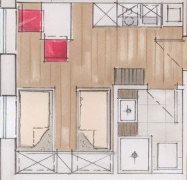 Grundrissbild Zimmer ReblausKüchenzeile und separate Sitzecke sind mit zeitgemäßem Komfort ausgestattet und bilden eine eigene Einheit im Raum. Mit abgetrenntem Bad-/Duschbereich. Die beiden getrennten Einzelbetten (90cm x 200cm) sind auch für gute Freunde und Freundinnen eine prima Wahl. Bei Nichtgebrauch können die Einzelbetten hochgeklappt werden, so dass die Fläche des Zimmers voll genutzt werden kann.